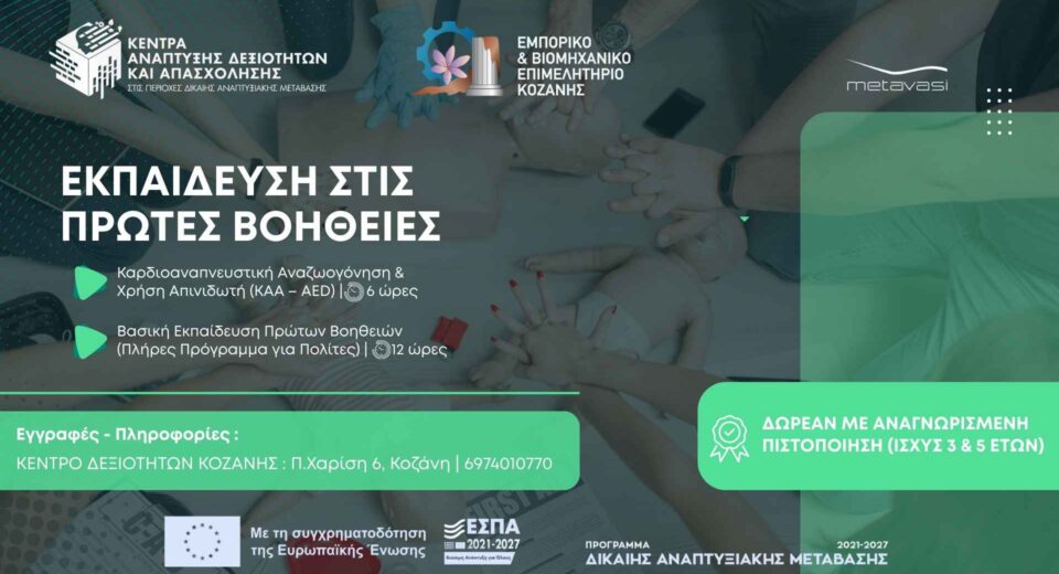 Επιμελητήριο Κοζάνης: Δωρεάν εκπαίδευση και πιστοποίηση Πρώτων Βοηθειών για εκπαιδευτές οδηγών στην Κοζάνη