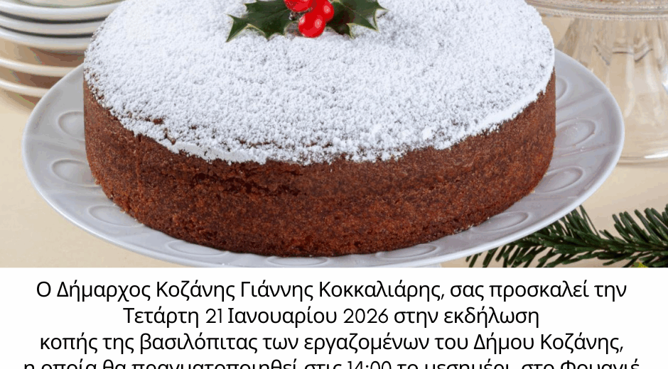 Τη βασιλόπιτά τους κόβουν οι εργαζόμενοι του Δήμου Κοζάνης, την Τετάρτη 21 Ιανουαρίου 2026 και ώρα 14:00, στην Κοβεντάρειο Δημοτική Βιβλιοθήκη