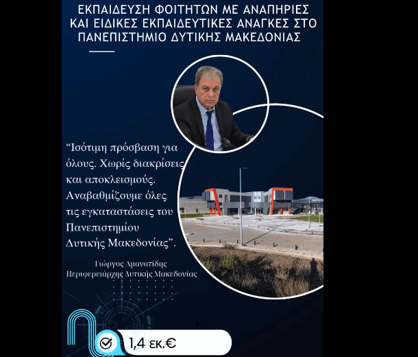 Μια ιδιαίτερα σημαντική πράξη, που αφορά τη βελτίωση της προσβασιμότητας και της ισότιμης συμμετοχής στην εκπαιδευτική διαδικασία, εντάχθηκε στο Πρόγραμμα «Δυτική Μακεδονία» του ΕΣΠΑ 2021-2027. Πρόκειται για το έργο με τίτλο «Βελτίωση προσβασιμότητας και της ισότιμης πρόσβασης στην εκπαίδευση φοιτητών με αναπηρίες και ειδικές εκπαιδευτικές ανάγκες στο Πανεπιστήμιο Δυτικής Μακεδονίας», συνολικού προϋπολογισμού 1,4 εκατομμυρίων ευρώ, […]