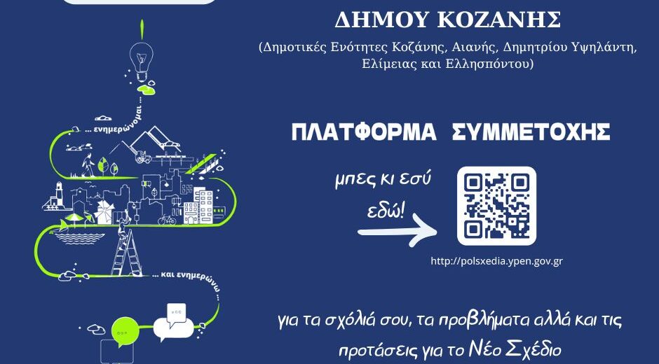 Ο Δήμος Κοζάνης απευθύνει κάλεσμα σε δημότες και φορείς για συμμετοχή στην ανοιχτή ενημερωτική εκδήλωση που θα πραγματοποιηθεί στην Αίθουσα Δημοτικού Συμβουλίου «Κοβεντάρειο», τη Δευτέρα 15 Σεπτεμβρίου 2025 στις 18:00 το απόγευμα, όπου θα παρουσιαστούν τα Εναλλακτικά Σενάρια των αναδόχων μελετητών για τα Τοπικά Πολεοδομικά Σχέδια του Δήμου Κοζάνης. Τα Τοπικά Πολεοδομικά Σχέδια (ΤΠΣ) είναι το […]