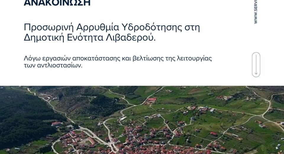 Ενημερώνονται οι κάτοικοι της Δημοτικής Ενότητας Λιβαδερού ότι λόγω εργασιών αποκατάστασης και βελτίωσης της λειτουργίας των αντλιοστασίων, ενδέχεται να παρουσιαστεί προσωρινή αρρυθμία και χαμηλή πίεση, κυρίως σε κατοικίες που βρίσκονται σε υψόμετρο κοντά στις δεξαμενές. Τα συνεργεία εργάζονται με στόχο την ταχύτερη δυνατή αποκατάσταση και τον περιορισμό της όποιας ενόχλησης. Ο Δήμος ευχαριστεί τους κατοίκους […]